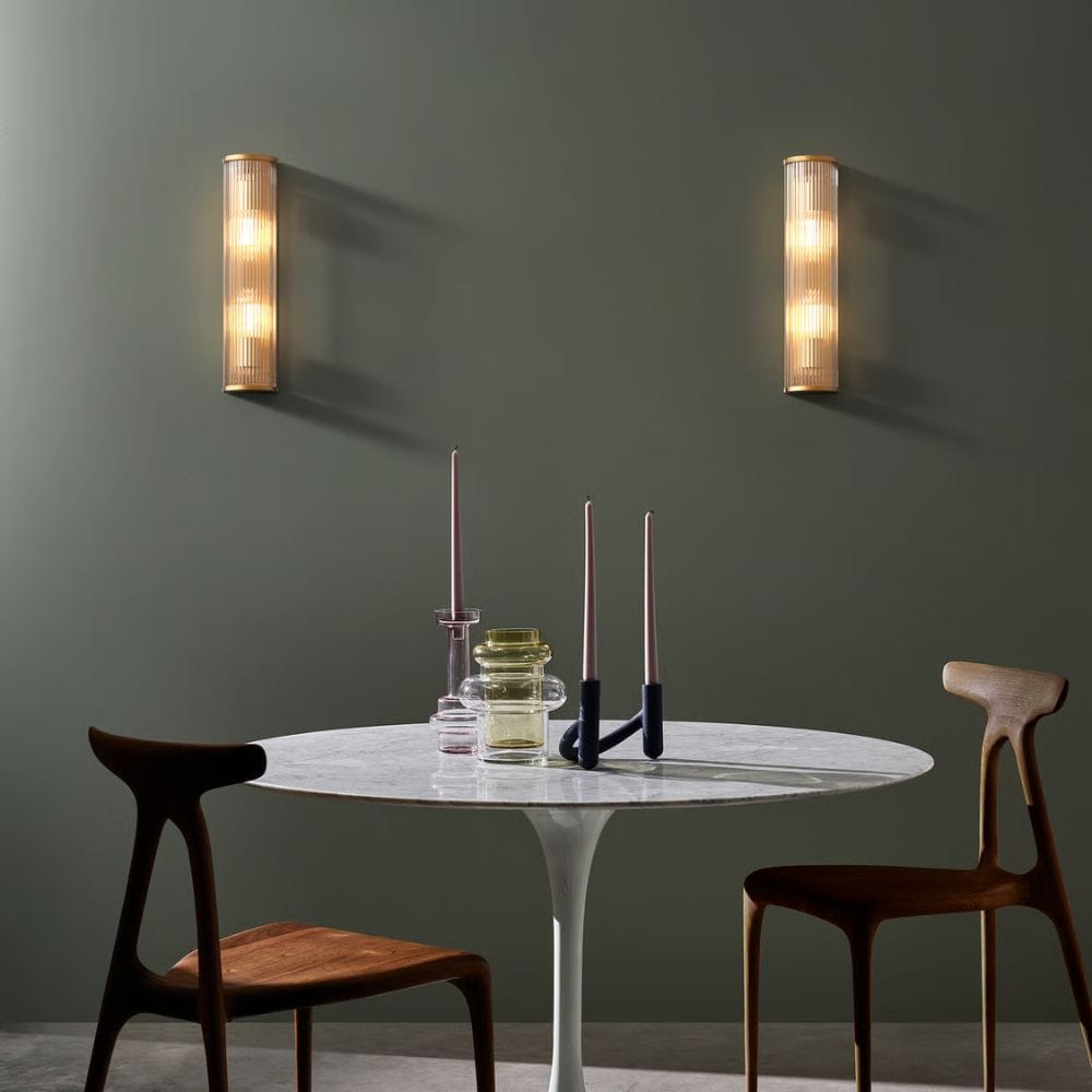 Inspired by Art Deco luminaires, the Avignon Round 525 wall light is large in scale adding instant drama and presence to a space. Tall and slender with a rounded profile, it features sparkling clear glass rods, die-cast antique brass end caps and exudes ambient, glare-free illumination. Designed with hospitality settings in mind, the light fixes to the wall with a single discreet screw, so nothing distracts from its seamless look.