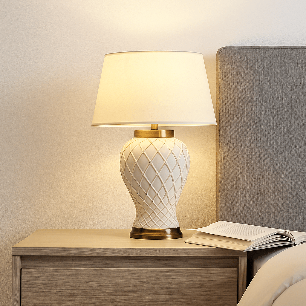A sophisticated table lamp crafted in ceramic with an ivory white glaze and a trellis design pattern.