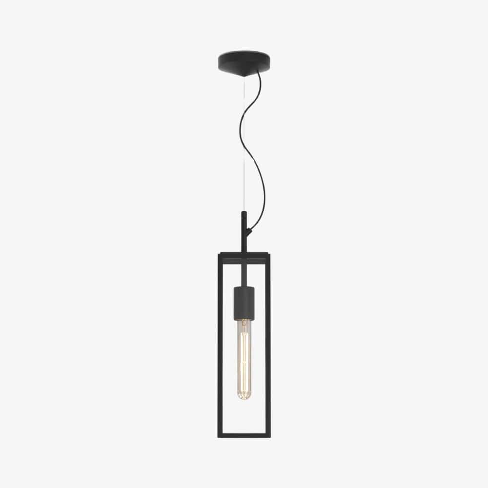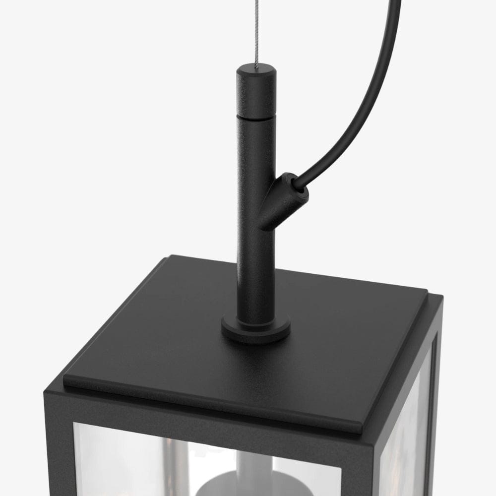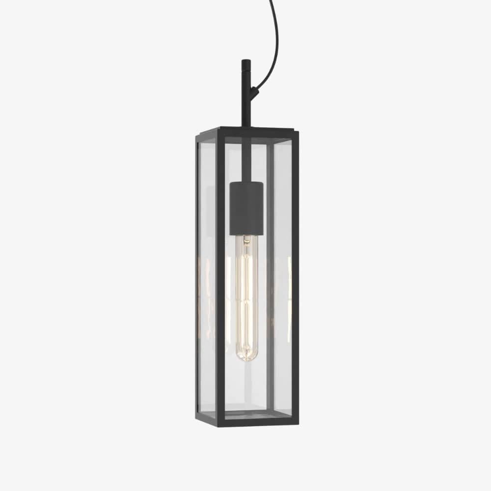 A modern interpretation of the traditional lantern in a slimline box shape, the Harvard Pendant outdoor light brings a crisp elegance to a hotel entrance, complementing any style of architecture. It has an IP44 rating and a textured black powder-coated finish for a dramatic look with outdoor-grade protection.