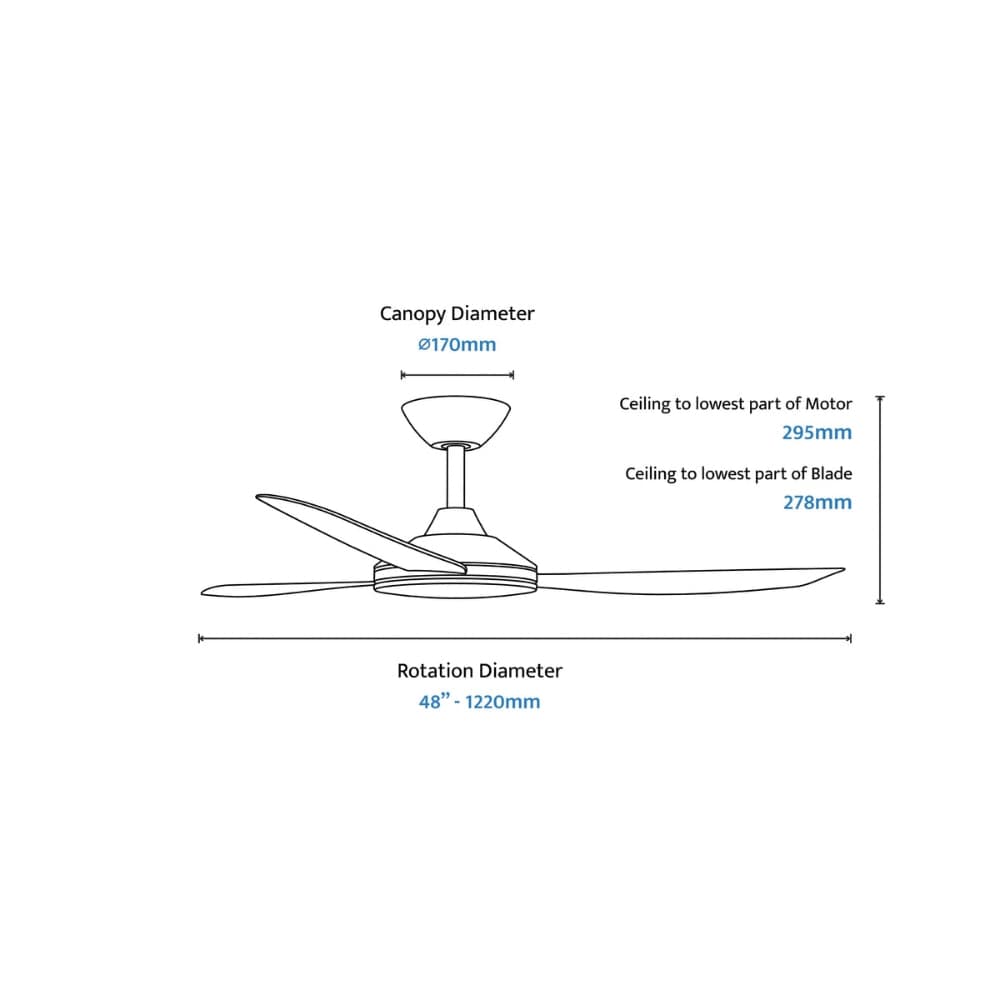 With a six-speed remote control and airflow up to 16,094m³/hr, it delivers exceptional comfort. Available in 48", 52", and 56" sizes, it suits various spaces and supports ceilings up to 10°, or 38° with a raked ceiling kit. Optional extension rods (900mm and 1800mm) are available for high ceilings, and it is compatible with a DC Wall Control Kit.