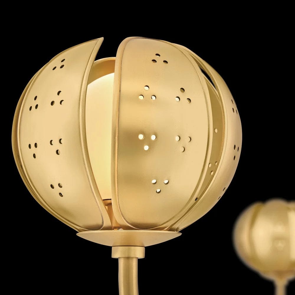 A work of luminary art, Anthos elevates its floral-inspired form with alluring illumination. Raised edge details and distinct perforations accentuate each blossom crafted from solid unlacquered brass petals. Radiant LED lamps enveloped by blown etched opal glass transform the surrounding space with a captivating interplay of light and shadow.