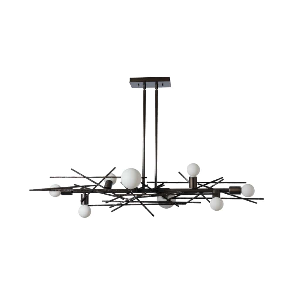 Metal branches and “twigs” serve as key elements of the Brindille 8-Light Linear Pendant. The bark-like texture is the result of our artisan’s use of a hammer known as “Big Blue” in our Vermont forge. David Kitts, who designed this fixture, intended to “take our classic hammered Brindille elements and bring them into a more contemporary setting form, scale and light source” with this stunning pendant.