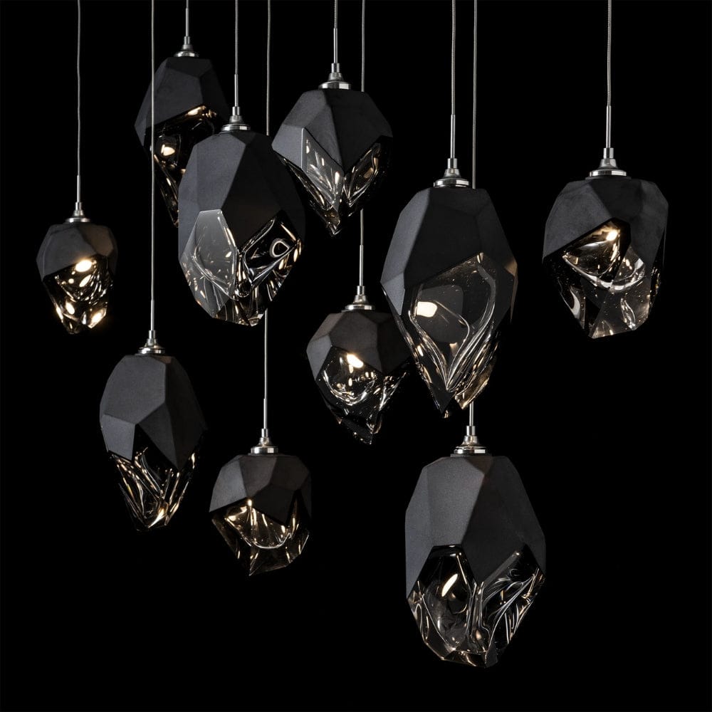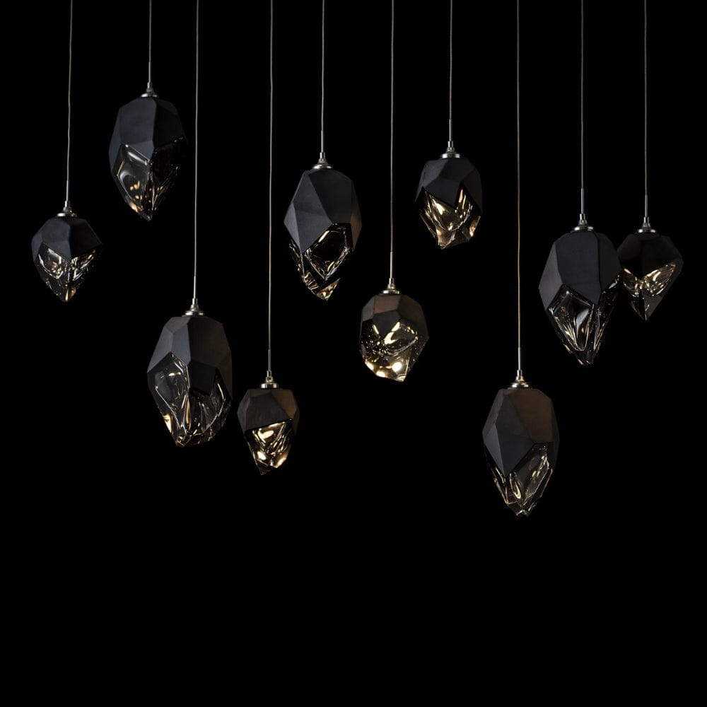 Five Large Chrysalis pendants and five Small Chrysalis pendants hung from a rectangular canopy. Each pendant may be individually adjusted for a custom look. Note, the upper canopy can will always be black while the canopy faceplate will match the selected finish.