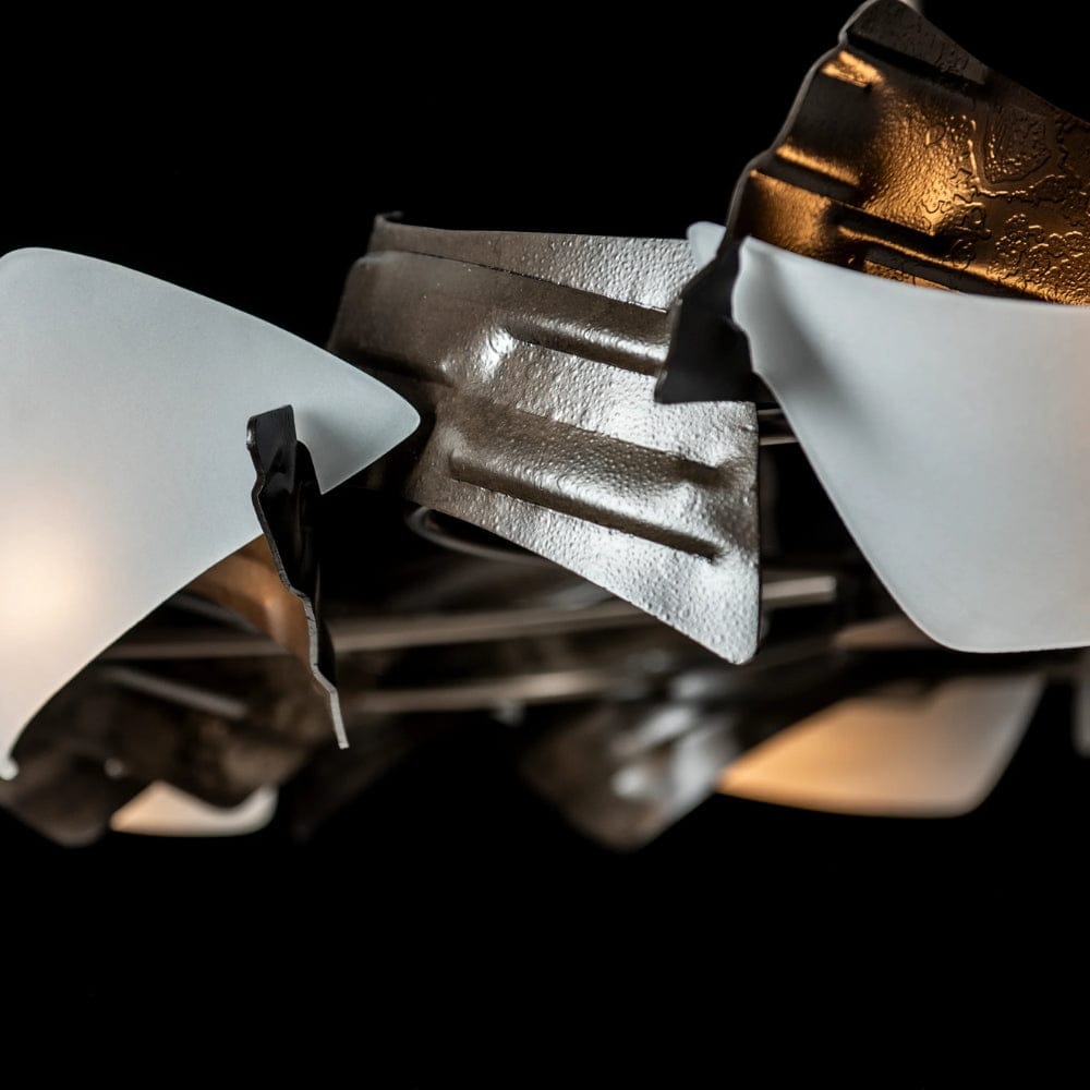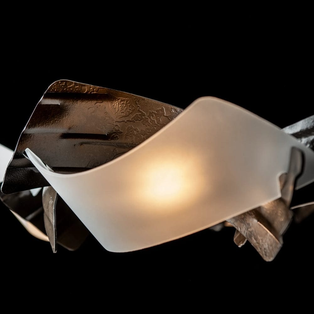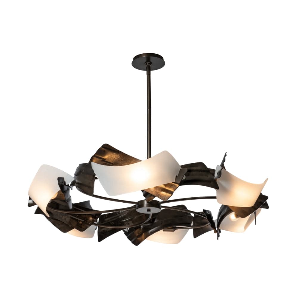 Designer Jason Hancock was inspired by the rolling waves of the sea, easily seen in the Crest Circular Pendant that embodies that essence of both strength and grace. Its hammered steel pattern, curved plates and art glass create a sense of ebb and flow with six lights illuminating the space.