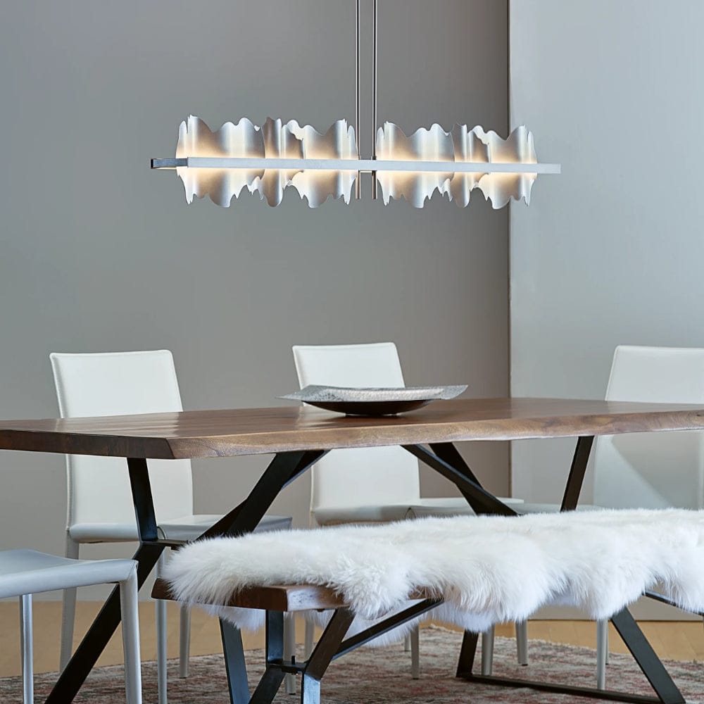 The Hildene Pendant features metal plates crafted into dramatic hills and valleys that are illuminated by LED lightguides encased in its central frame. A large, linear pendant suspended by two central rods, the Hildene is offered with a two-toned finish option, with the canopy/rods/frame in one finish, and the metal plates in a choice of accent colors. Also available as a smaller pendant, a large circular pendant, and a wall sconce.