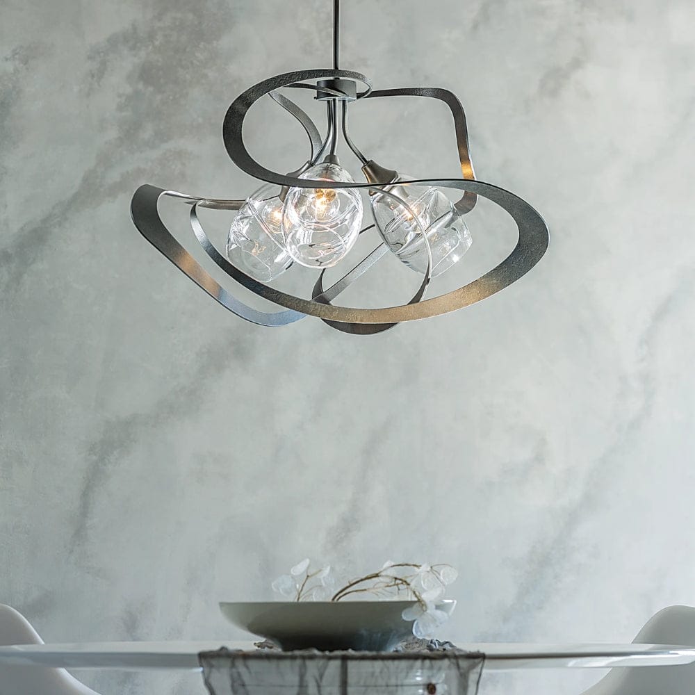Sculptural steel lends itself to the free-flowing style of the Nest Pendant. Every angle provides a graceful organic composition. Three thick blown-glass shades, with contoured detailing, cast a soft ambient light over a wide area.