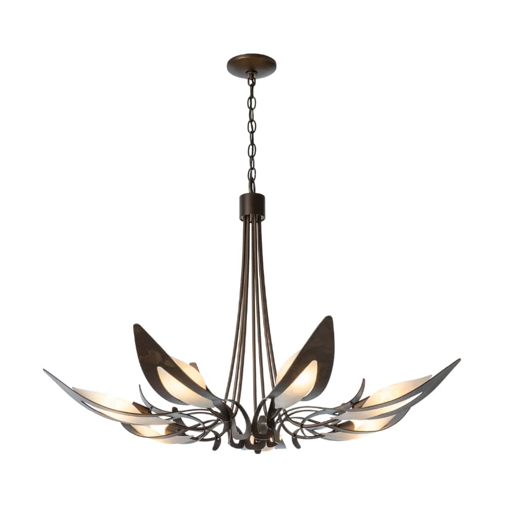 Skilled Vermont artisans hand-forge and shape this beautiful lighting fixture, reminiscent of a parasol form. The forged metal texture comes through in each detail. Handmade slumped art glass is nested into each of these seven arms. Parasol designer Jason Hancock recommends using a "milky" candelabra bulb for the perfect effect.