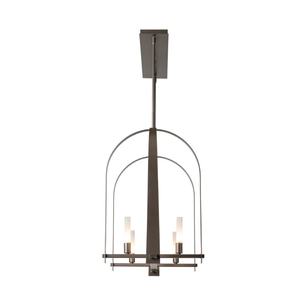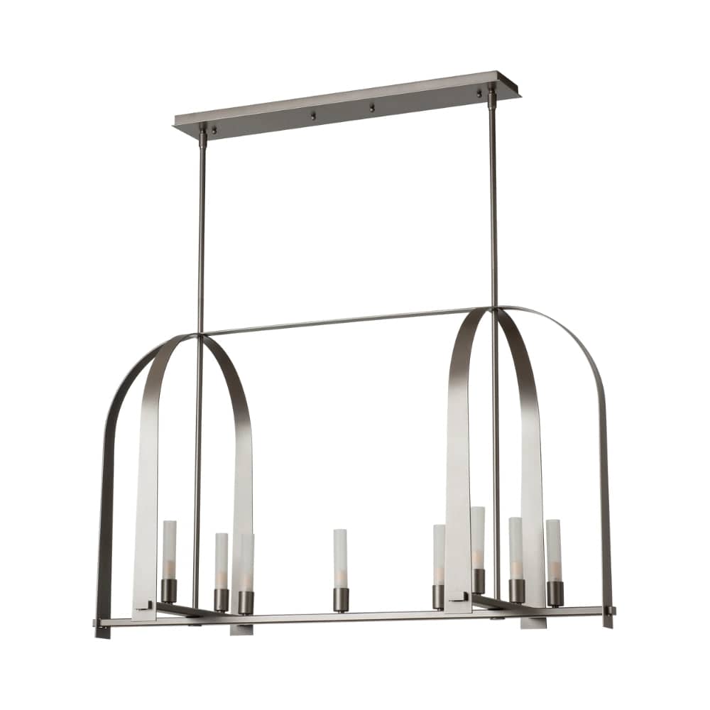 The Triomphe 9-Light Linear Pendant is a geometric, linear design features intersecting arches with a distinctive shape. The Triomphe takes its inspiration from traditional cage chandeliers, but with contemporary design touches that give it an open feel. Handcrafted of steel, it features two sets of intersecting arches, with frosted glass tubes fitted to the steel traverses with Craftsman tenon details. A Multi-Stem system provides great height adjustability.