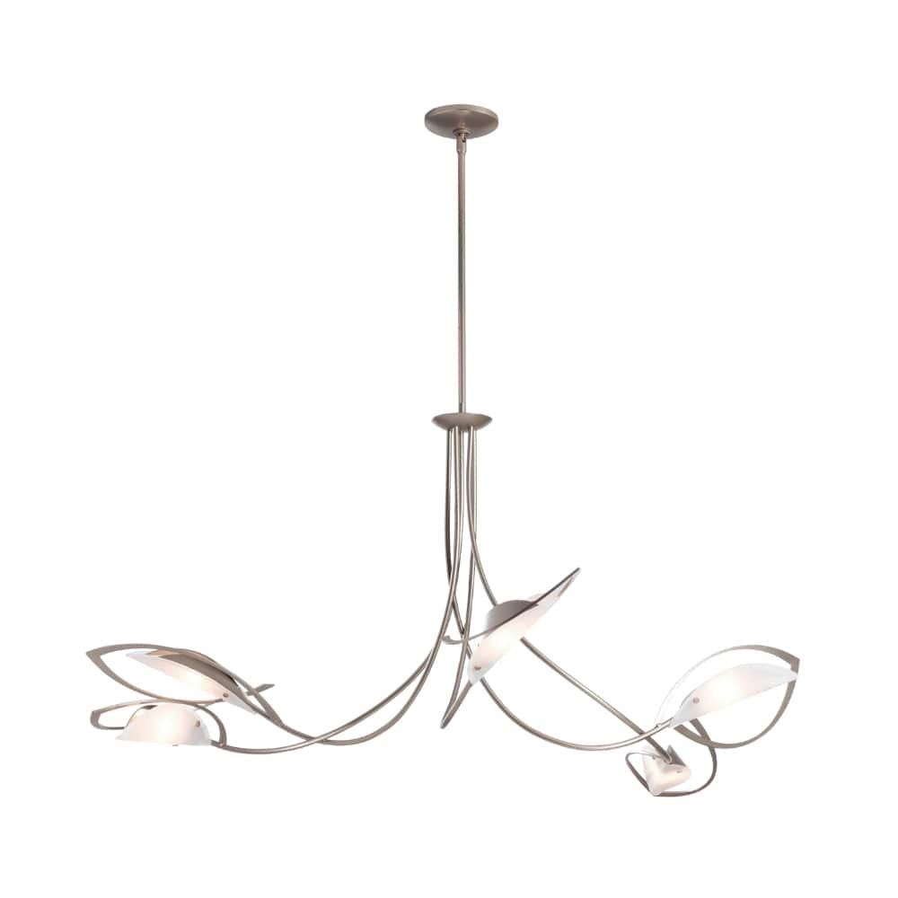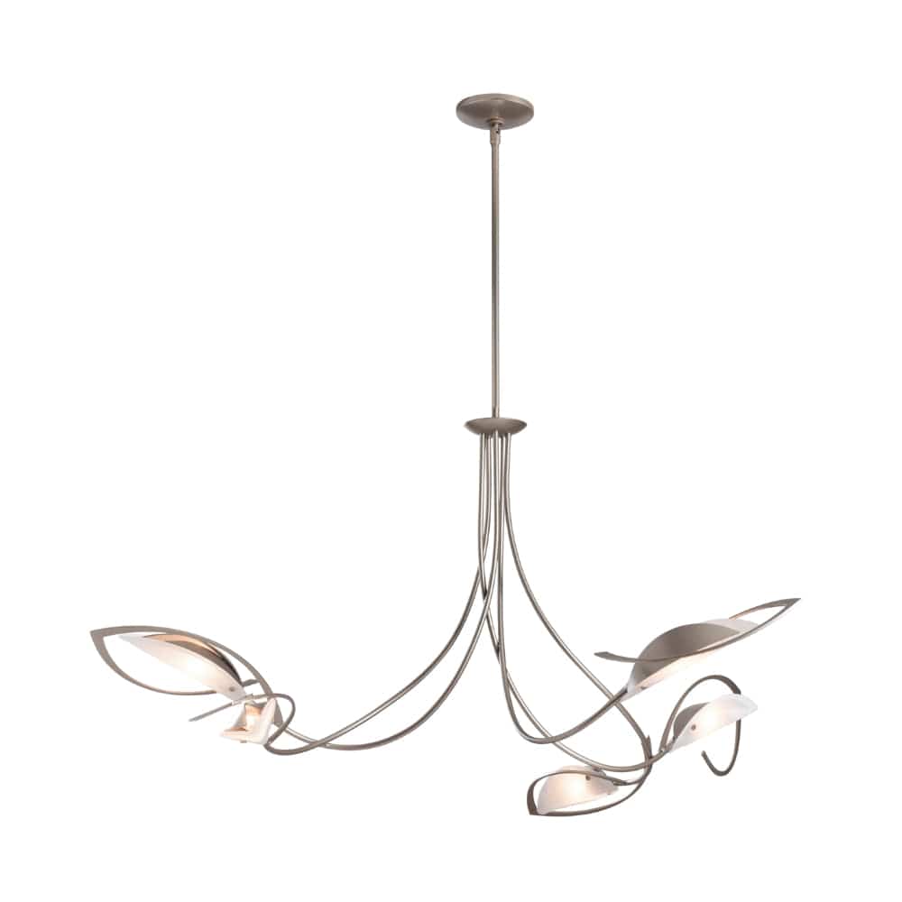 The large-scale Aerial Pendant strikes an artistic balance of materials. Leaf-like steel forms are complimented by art glass—created through heating and draping over contoured forms. Asymmetrical and organic design lends itself to the botanical feel of the fixture.
