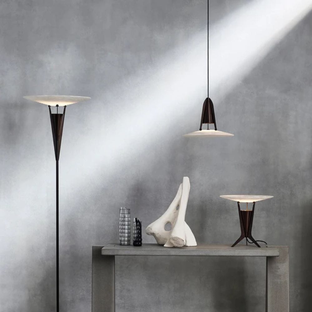 Sourced from its namesake region of Spain, Aragon explores the translucent and reflective properties of alabaster stone. Playing with texture and form, the opalescent, sculptural stone contrasts against a lustrous machined brass body. The conical, stepped shade is designed to both reflect and diffuse light, creating a soft warm illumination.