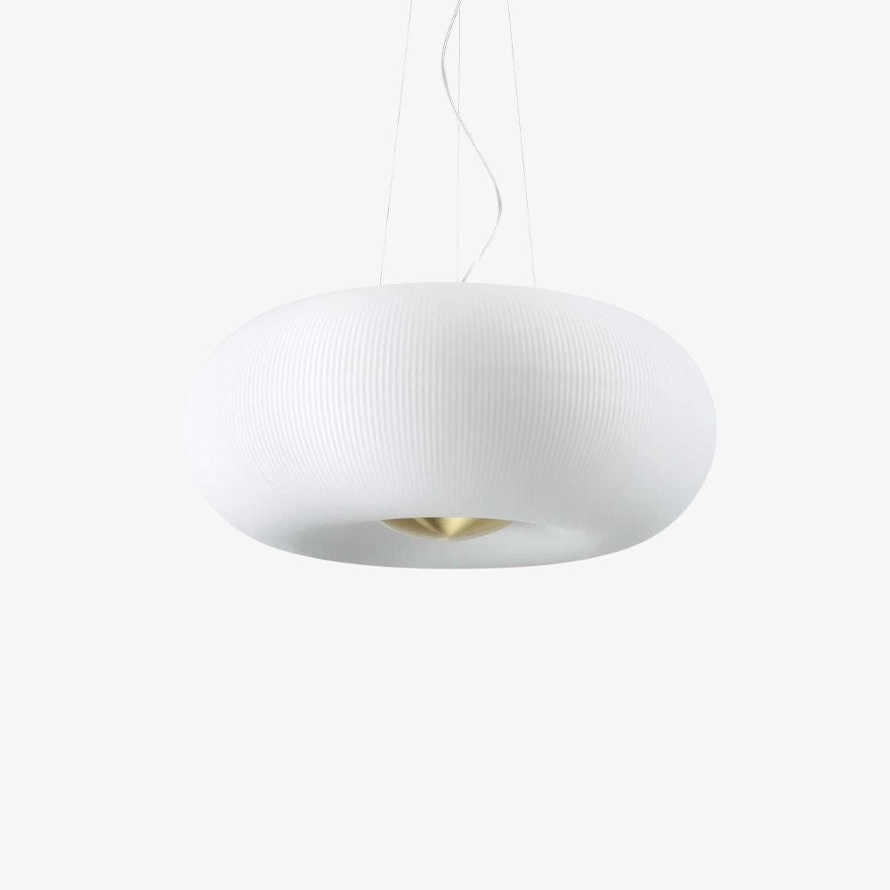 This decorative pendant light features a white acid-etched blown glass shade with a pleated pattern for soft, evenly diffused light. The brass metal details add a sense of elegance and art-deco aesthetic to the overall look of the pendant.
