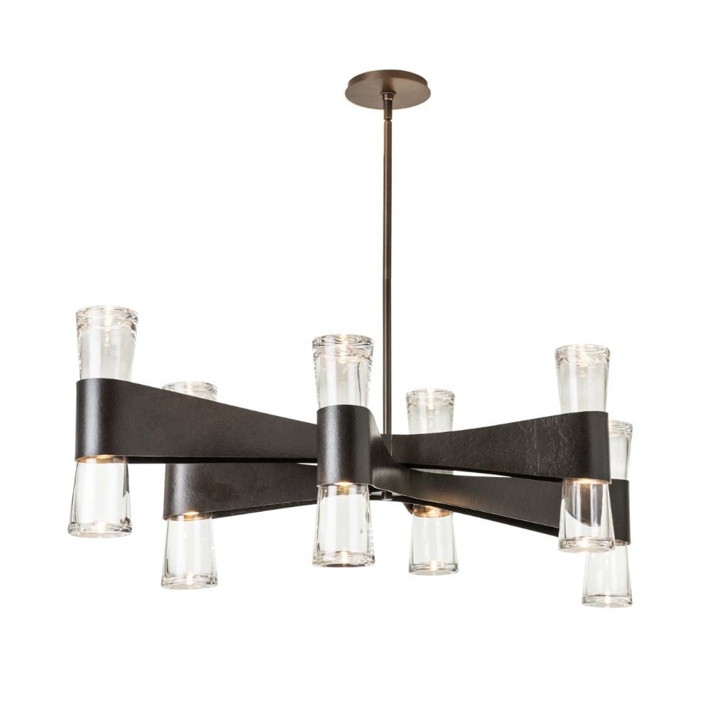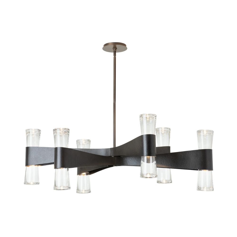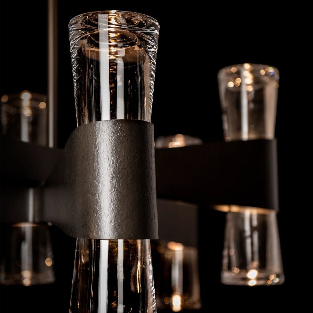 Artisanal forging on display, this grand Bellis chandelier gives an oval shape with its outstretched arms. Stunning, classic with a transitional style, the Bellis is a showstopper. Each of the six arms holds a duo of light. Up- and downlights are contained within crystal clear, thick, slightly flared glass. Available in any of our standard interior finishes.