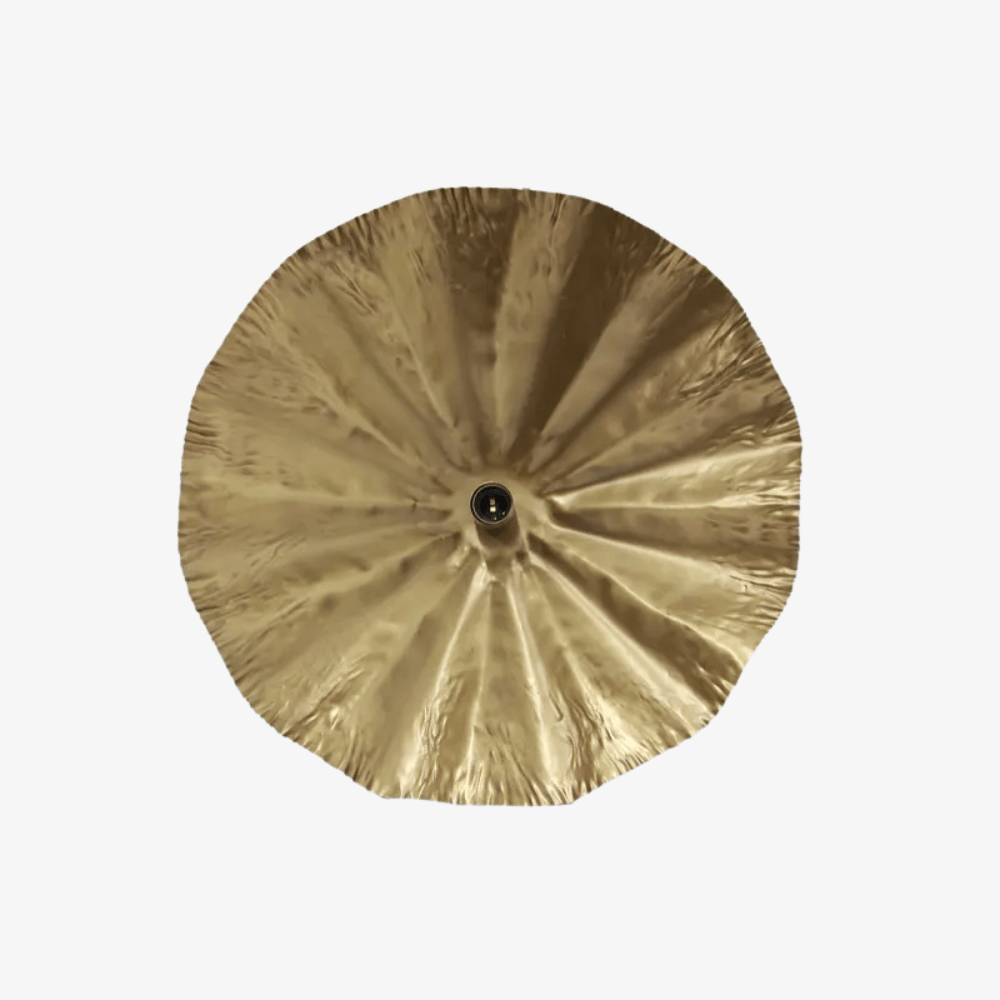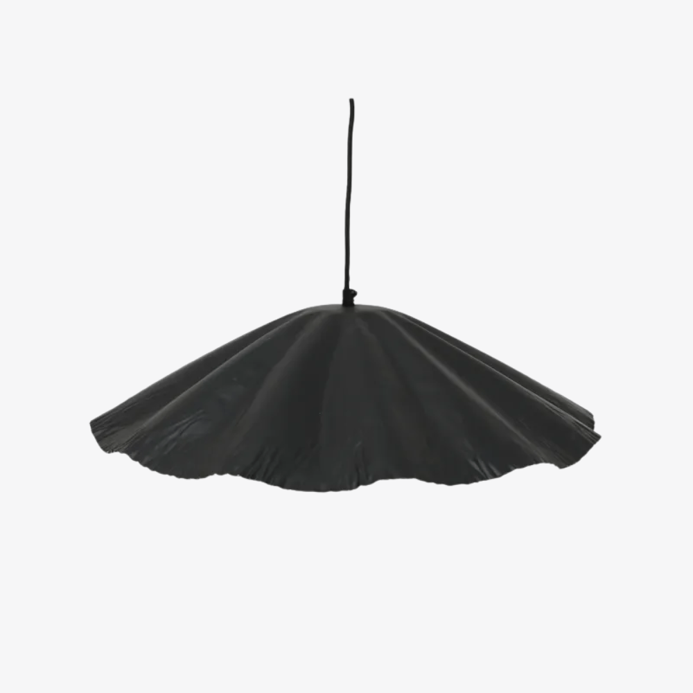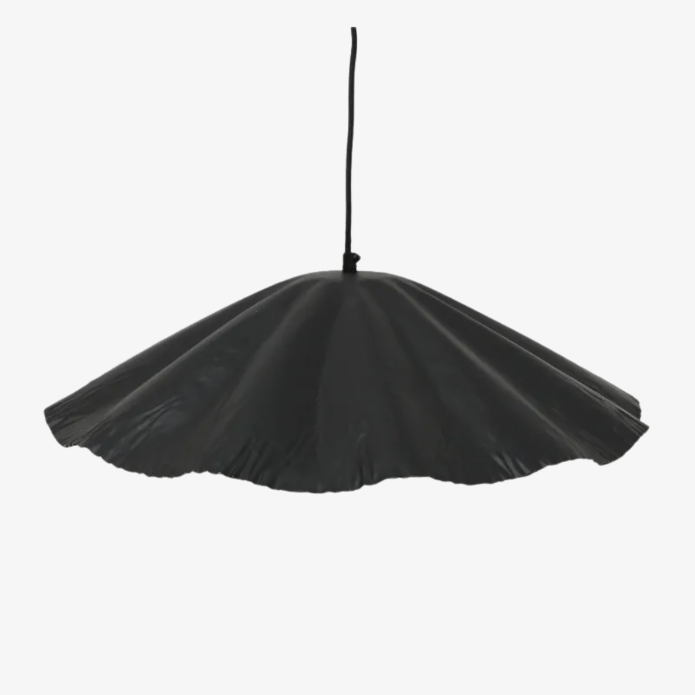 This large Crimped Pendant features an industrial sheet iron design with a unique scalloped wave shape. The organic form contrasts black on the outside with a warm gold interior, creating a dynamic and striking lighting statement. Available in large and small.