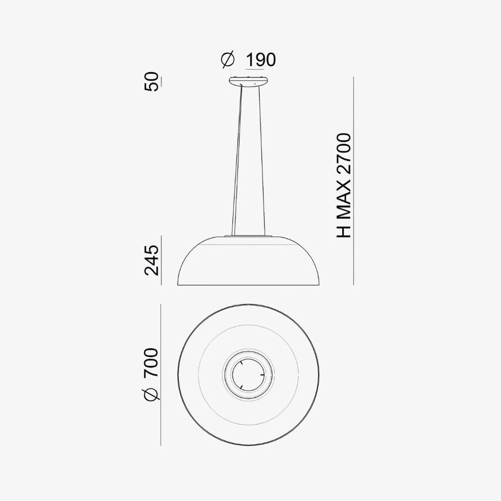 Diffuser in transparent laser micro engraved PMMA with OptiLight™ technology and thermal-blown. Ring in white painted aluminium with controlled emission, dimmable topLED source with high visual comfort. Ceiling rose in white painted metal. The support cables act as conductors.