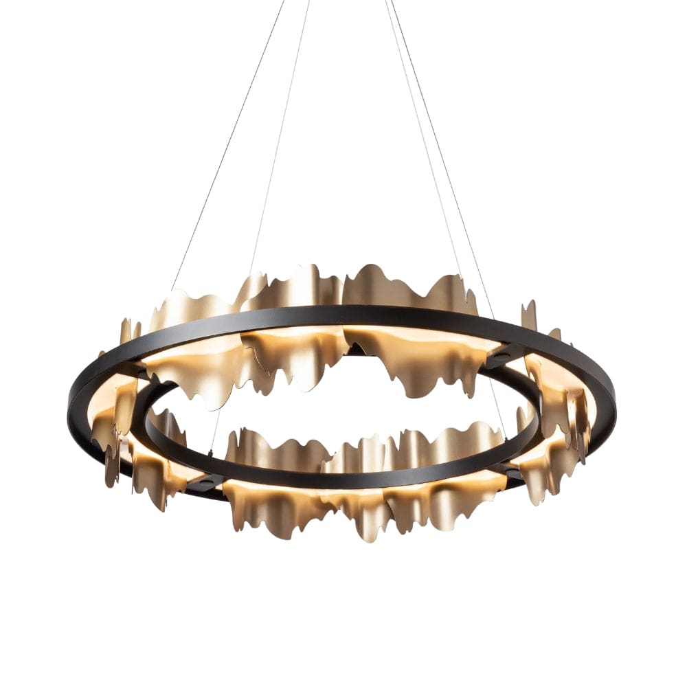 This magnificent and dramatic Hildene Circular pendant, with its crafted hills and valleys creating shadow and light, is a focal piece in any space. Part of the Hildene Collection, this large pendant's curved metal plates are awash in up-and-down light emanating from the LED lightguide encased in its circular frame. The Hildene is offered with a two-toned finish option, with the canopy and frame in one finish, and the metal plates in a choice of accent colors. Also available as a linear cable-hung pendant, a large linear rod-hung pendant, and a wall sconce.