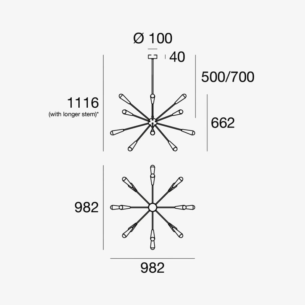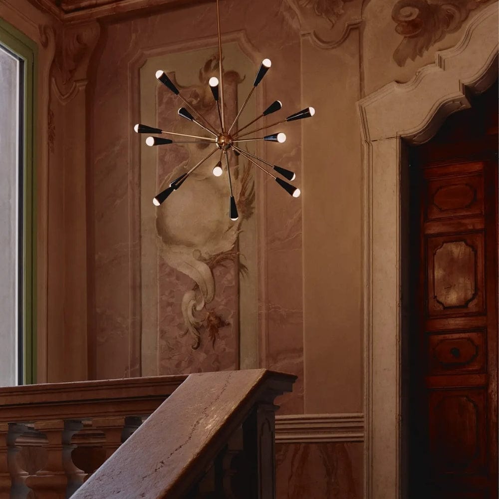 Like fireworks, the Sputnik expands in all directions in an explosion of light. The sixteen-arm structure in precious brass with galvanic gilding is elegantly combined with the ends available in black, ivory or in the lively multicoloured variant.