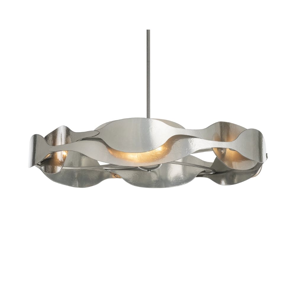 With a sensual interplay of light and shadow, the Waves Pendant suggests a fluidity of motion, an eternal circle of life. Heavily textured steel showcases the skill of the American metal crafters and artisans at the Forge.