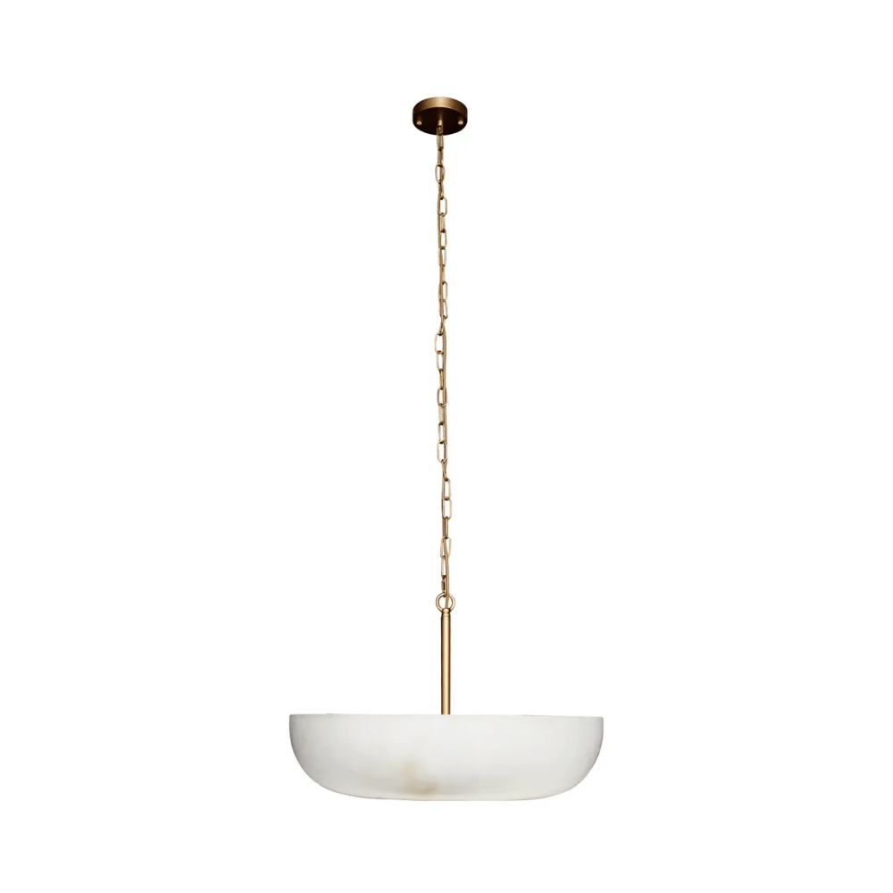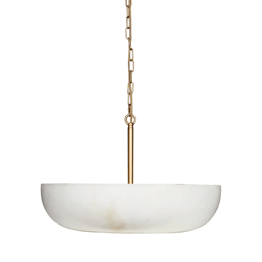 This exquisite alabaster look pendant light showcases the natural beauty of alabaster stone, complemented by a sleek brushed gold accent for a sophisticated finish. Sold individually, it pairs perfectly with its matching flush mount to create a harmonious lighting design. Ideal for living rooms, dining areas, or entryways, this pendant light offers warm ambient illumination and timeless elegance, seamlessly enhancing both contemporary and classic interiors.