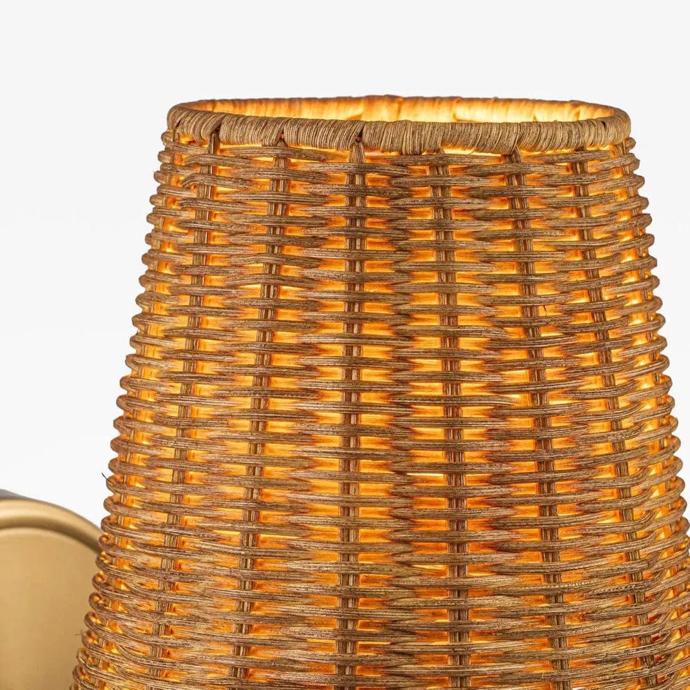 Athens Wall Light Antique Brass crafted from Iron and Rattan, offering subtle yet striking. This piece is great for hallways or accent lighting.