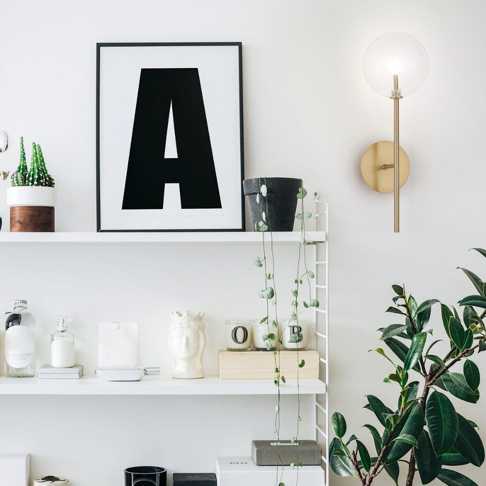 This stylish wall light features a slim, minimalist metal frame in either brass with a clear glass sphere.