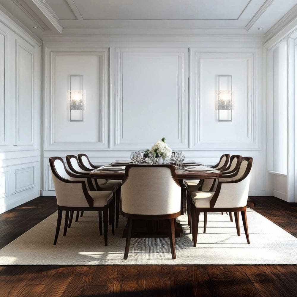 A tall, open rectangular piece of steel holds a large clear, textured glass square panel giving the Geo Sconce an angular yet distinguished allure. Very geometric in design, with clean simple lines, the Geo adds a touch of modern style to any space.