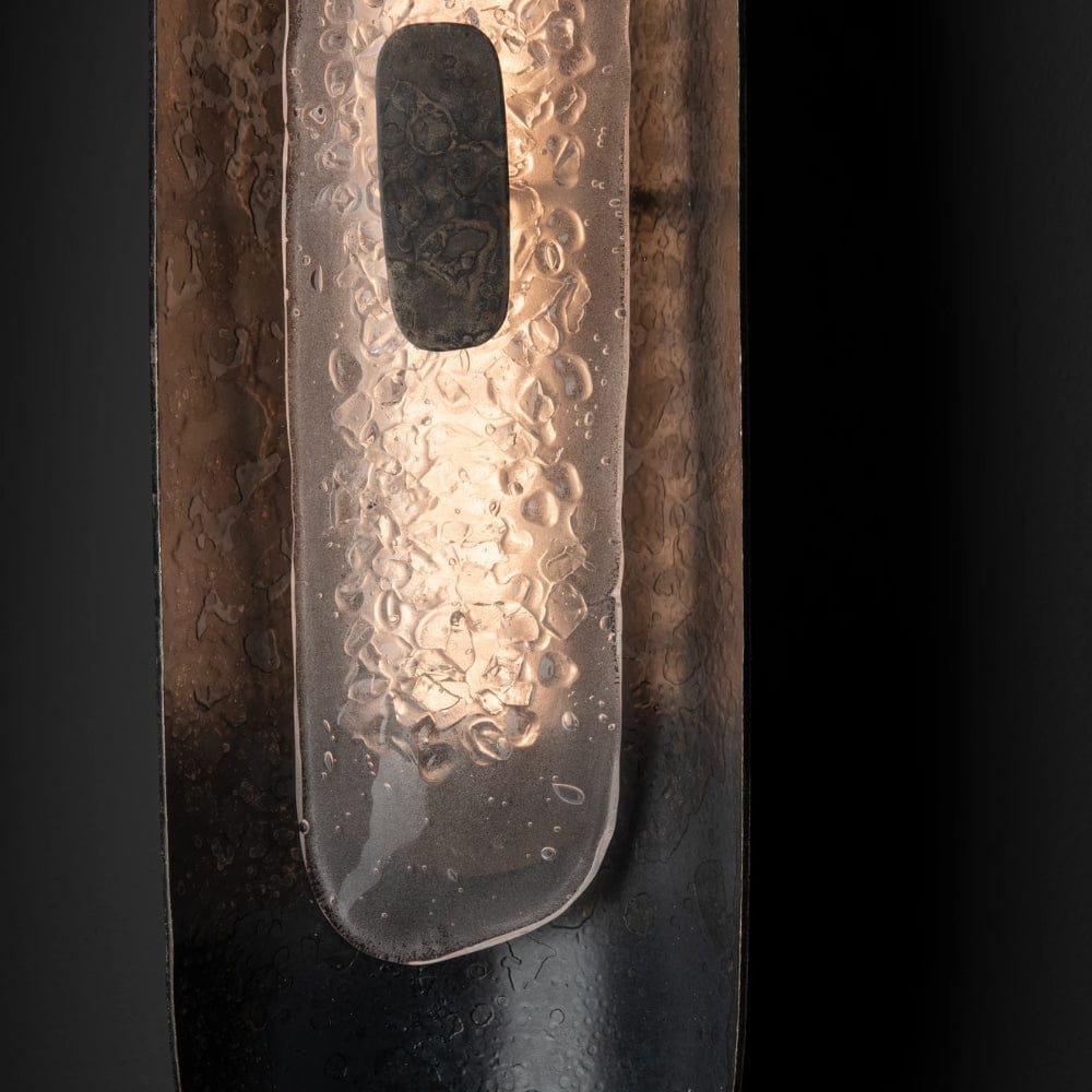 It's all in the details. The unique fritted glass. The detailed hand-forged rectangular steel medallion. The stunning texture on the gently shaped, large steel element that is a trademark exposing the fire's fingerprint on each piece forged in Castleton. Imagined to create a sumptuous spa-like environment, yet beautiful on any wall in the home, the Shield Small Sconce is 2' in height and ADA-compliant at just 3" in depth.