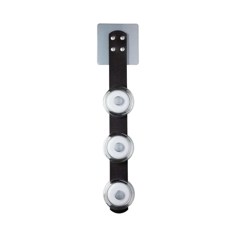 A brilliant trio! By popular demand, the three-light Snaps Sconce has arrived! Lots of functional, yet stylish light in a small, sleek form. A choice of three standard leathers (black, chestnut or white), or get creative and choose an option from our partner Spinneybeck's array of upholstery leathers (link provided). Each of the 3 LED discs is housed within a thick "puck" of clear glass or alabaster. Part of our patented SNAPS Collection.