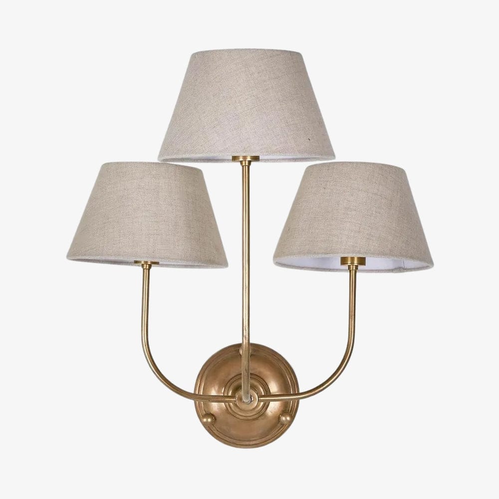 Our Trilogy lamp is traditional Victorian design with three curved arms wall light in antique brass or silver, with choice of coloured shades for the perfect combination and add character to older homes. With rectangular backplate, curve arm and cream candle sleeve, these will result rich warm and authentic aged look and feel which cannot be replicated. Recommended fabric lamp shade is ring fitting shade with diameter 7 or 8 inch on bottom.