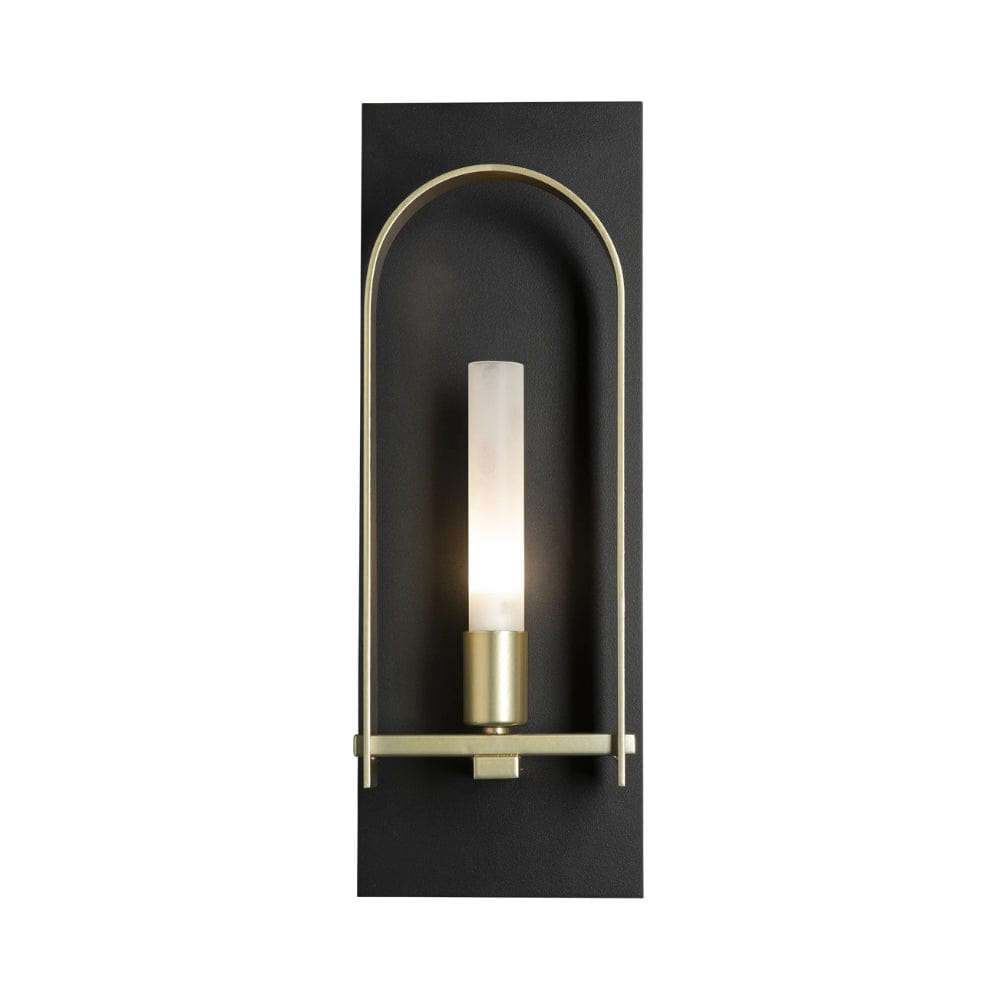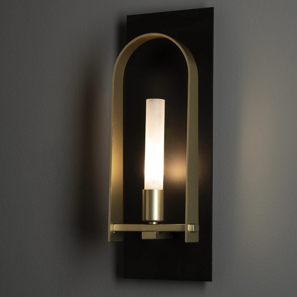 A beautiful, two-tone option wall-mounted fixture, the Triomphe 1-Light Sconce is perfectly suited to a variety of interior settings. Chic and sophisticated, yet with clean lines, this wall sconce shows off its Craftsman tenon details and modern frosted glass tube element. The elegant arch can be created with a contrasting finish for dramatic effect.