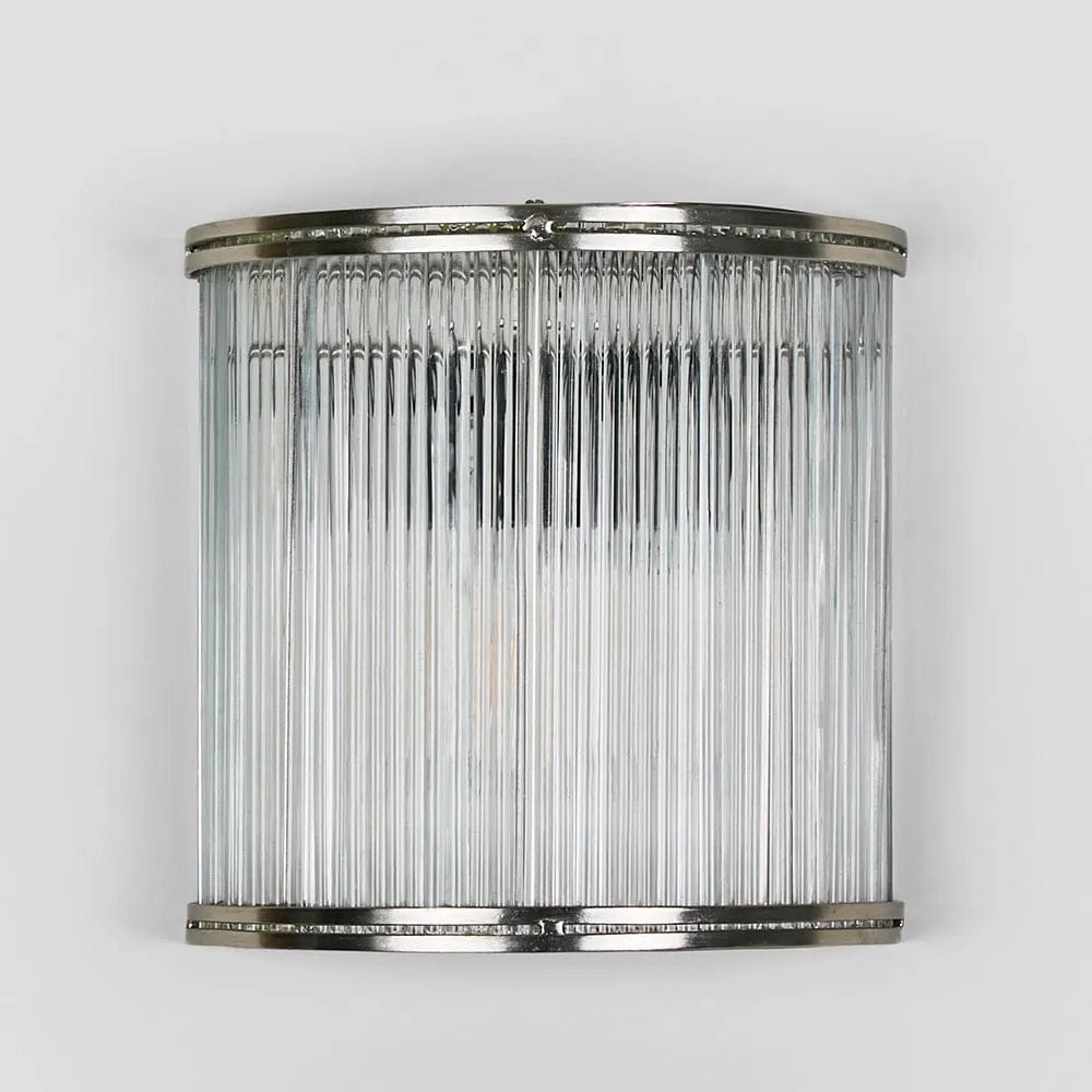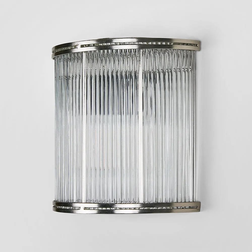 Our Verre wall light is half-round modern accent sconce that made from clear glass tubes with selection of polished nickel or brass frame metal top and bottom. The glass tubes diffuse light beautifully and produce amazing round reflection on the on the glasses. This wall light will instantly upgrade your foyer, bedroom or living room.