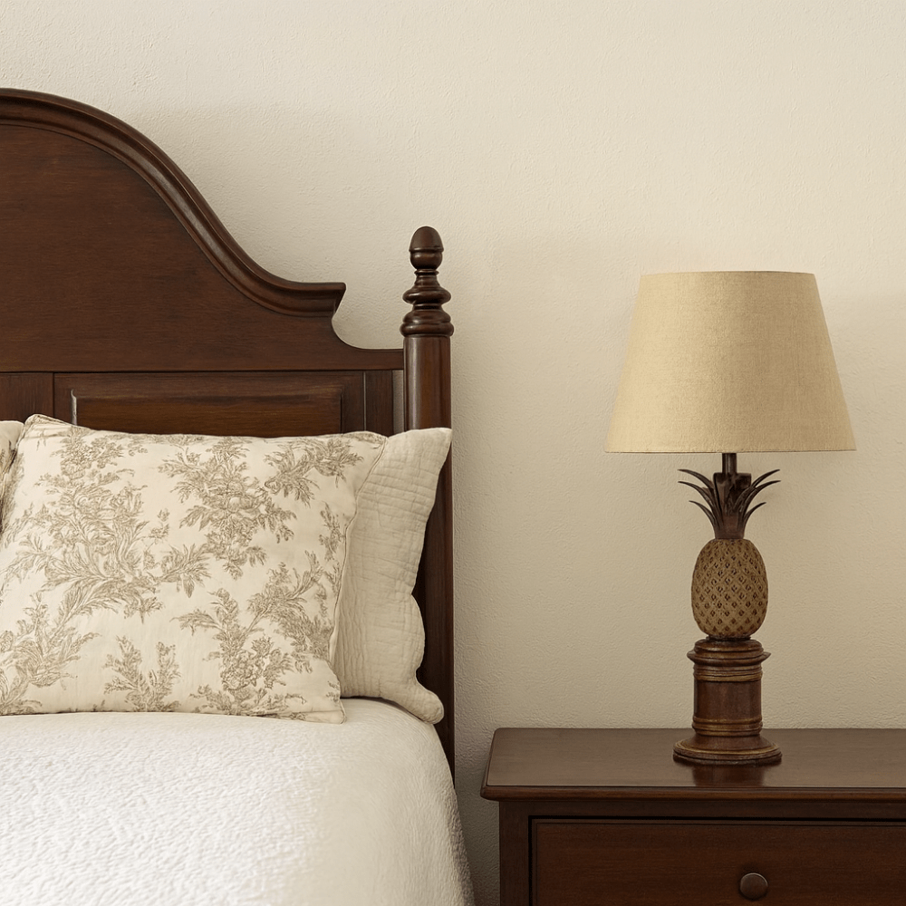 Bermuda pineapple table lamp has been very popular and become a symbol of hospitality in a sense of welcoming. The spiked leaves add eye-catching appeal to the detailed pineapple base. Four colours are available which are antique silver, brass, brown and white. Lamp shade that suits for silver and brass base is black or off-white linen. For the brown colour, the base will match with brown basket weave shade. With white lamp base, match shade would be in natural linen shade.