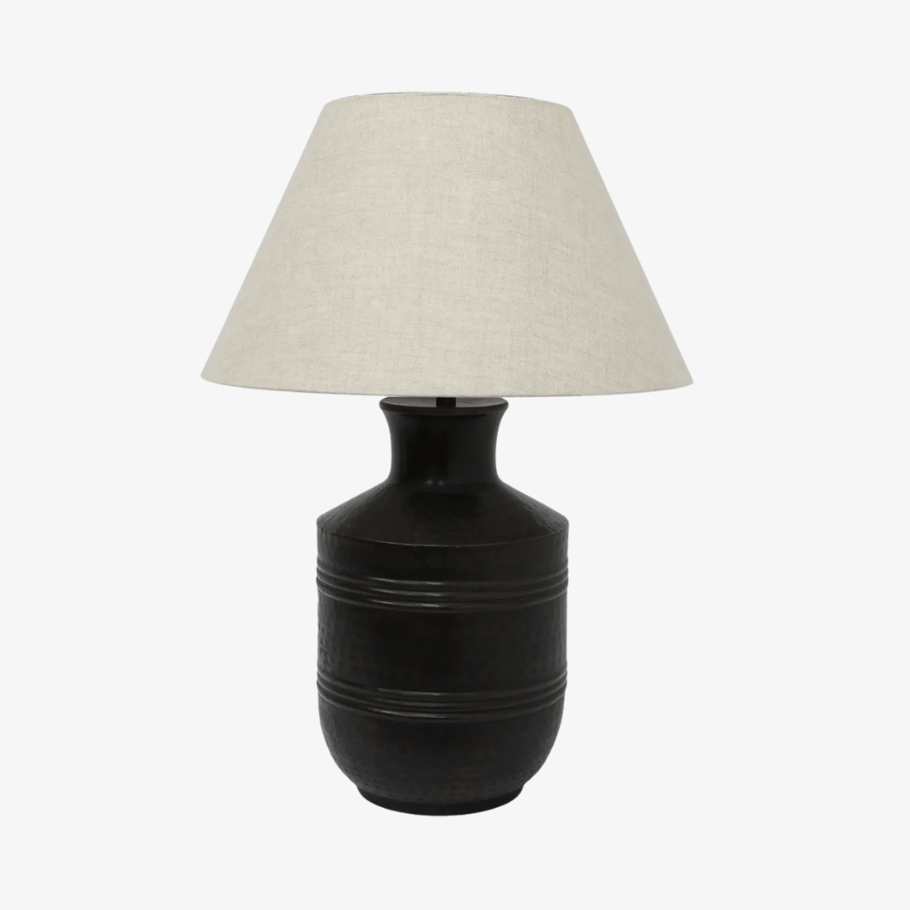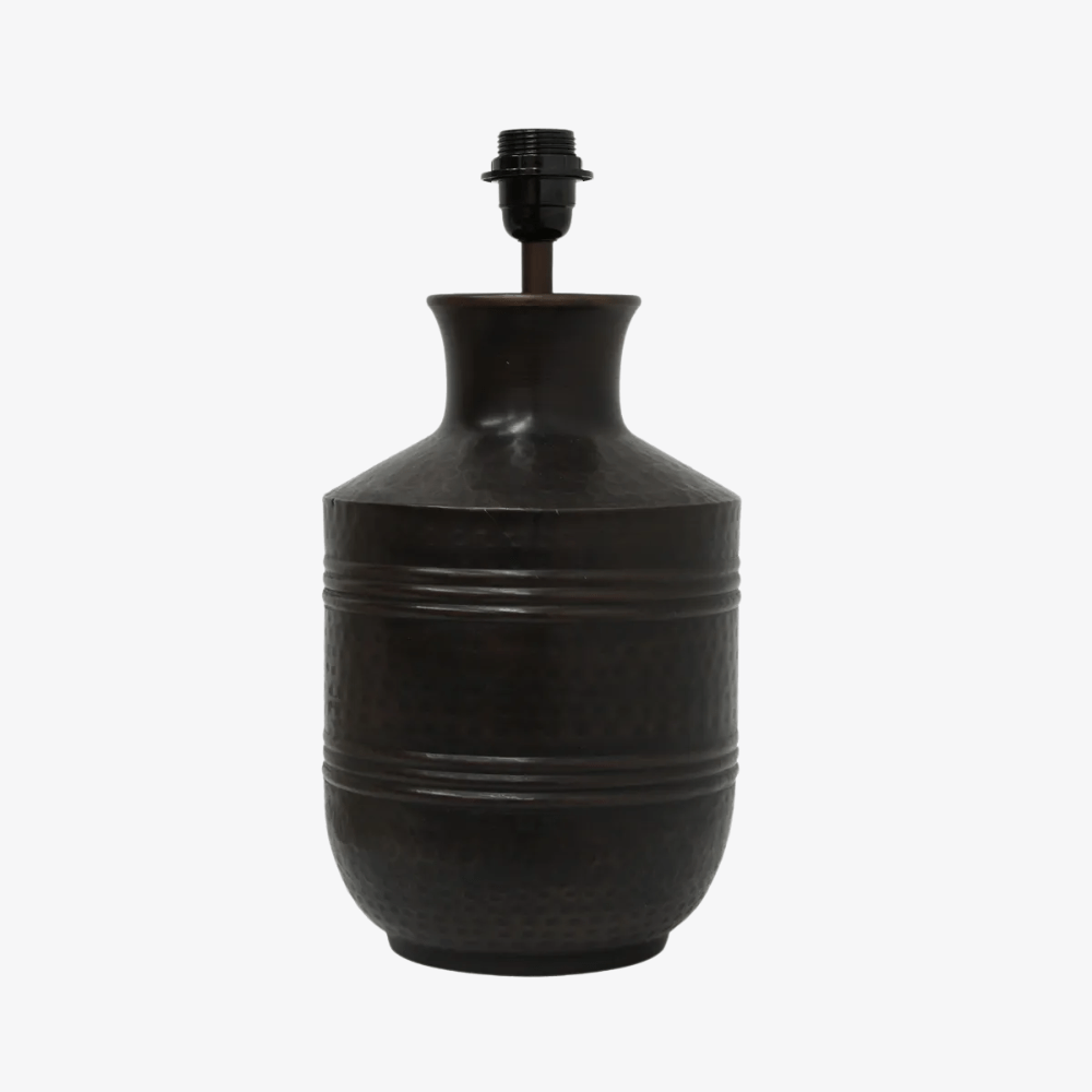 Crafted from aluminum with an antique copper finish and dark brown patina, the Bristol Lamp base features a beaten industrial design. Its vintage metal character adds a robust, timeless touch to any shade it’s paired with, enhancing your lighting setup effortlessly.