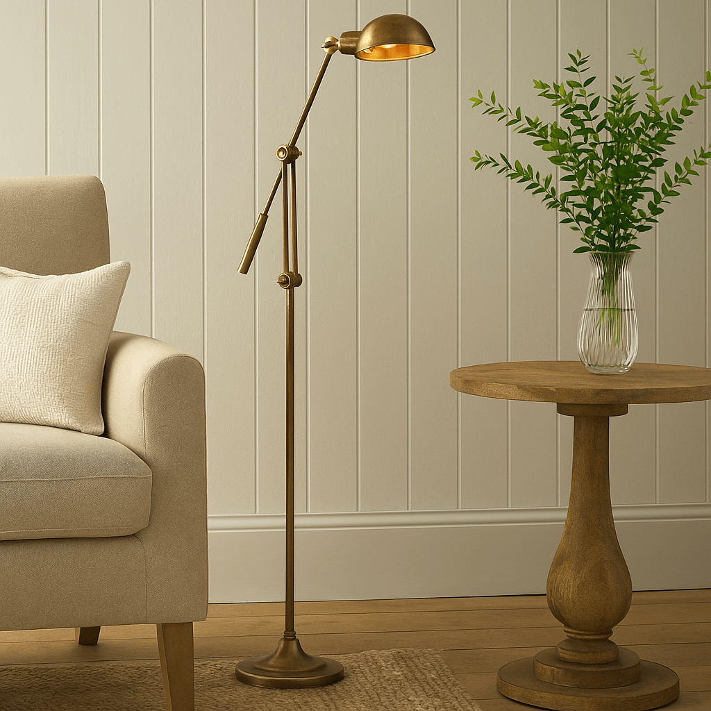 Calais is adjustable height floor lamp that made by solid brass metal to makes it easy customizing your lighting on reading books when you sit on the sofa lounge. Height can be manually adjusted from 1.2 to 1.5 metre high maximum. With length cord of 1.8 metre and foot switch make easy for you to move and switch on and off the lamp at no hassle. It is sleek and sophisticated floor lamp with refined details and timeless antique brass finish. Three colours are available with rib metal shade give true classic charm to this design.