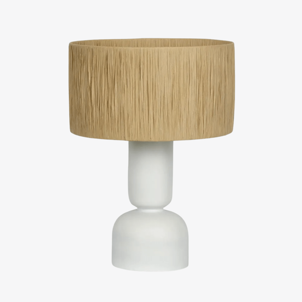 Clem Lamp Small White with Raffia shade crafted from Poly, offering a versatile charm. This piece is suitable for various settings.