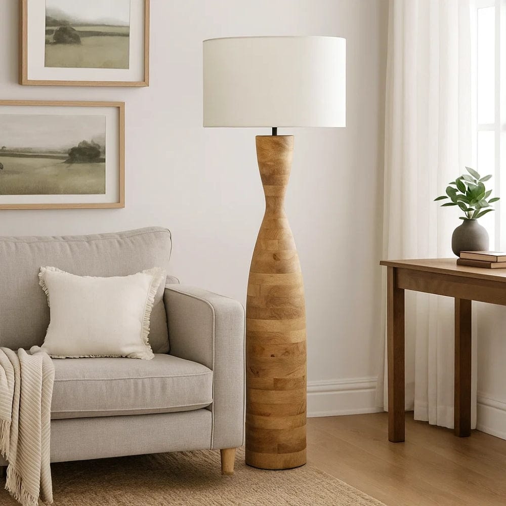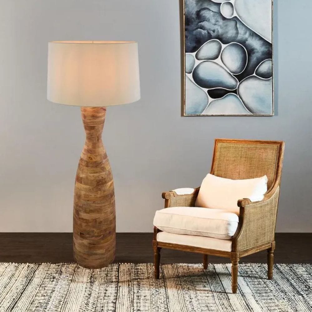 Illuminate your space with grandeur using our Esraj Floor Lamp Base in Natural, boasting a colossal wooden cylindrical base that exudes elegance with its graceful tapering towards the light fixture. Pair it with a linen drum lamp shade for a touch of refined sophistication that effortlessly enhances any room's ambiance. Whether gracing your living room, bedroom, or study, this stately lamp base commands attention and adds a timeless allure to your decor.