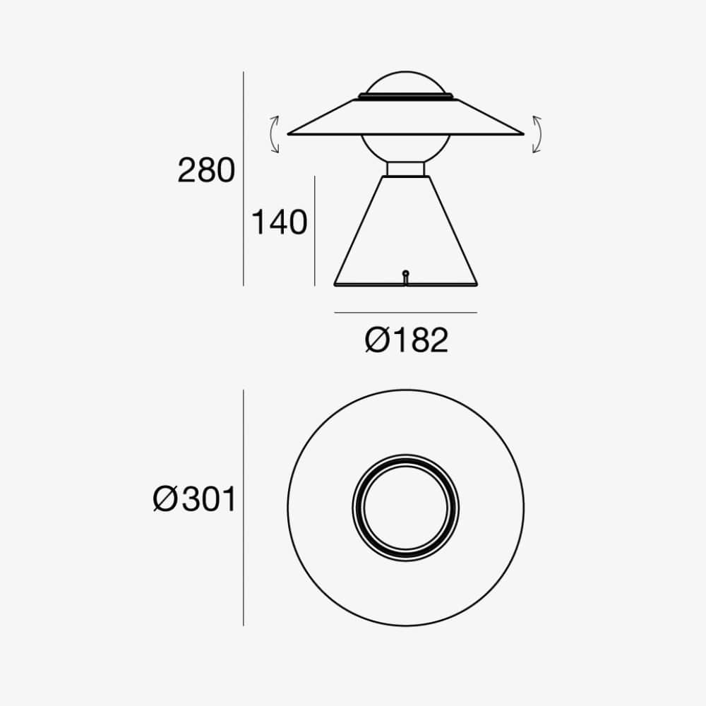 Fante’s light is easy to direct, thanks to the reflector on the head of the lamp that, like a wide-brimmed hat, defines the silhouette of an elegant, female figure. The freedom of inclination allows simultaneous control of both the illumination on the tabletop and the indirect diffused light for upward radiance. The conical base is soft and pleasing to the touch, perfectly completing the proportioned design.