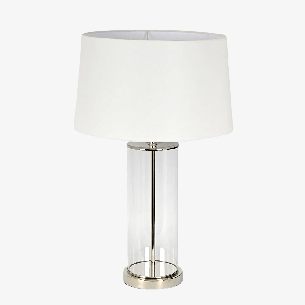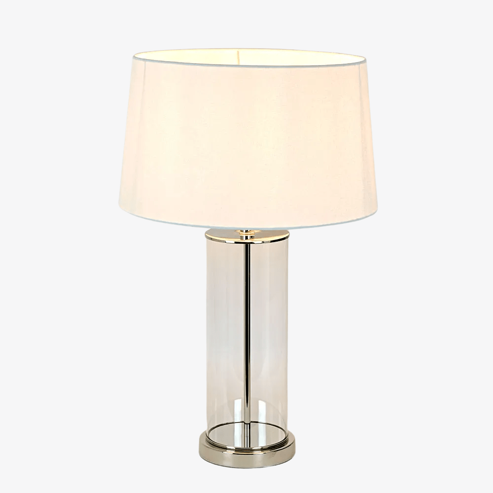 Our Iris is traditional style table lamp featuring antique brass/nickel/black with clear glass column base and sat on metal base. The lamp is individually switched by an inline switch and would be great for lighting in a lounge, bedroom or reception of any traditional style property. This solid glass lamp is stylishly illuminating. The simple, graceful, circular shape beautifully reflects the light.