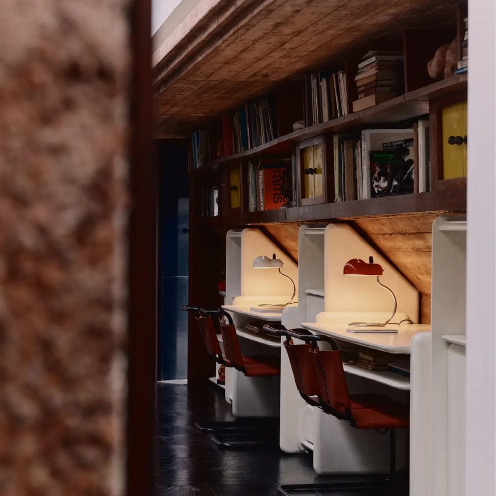 Minitopo is a fascinating object of automotive inspiration: the slits on the body are reminiscent of the vents on a 1960s sports car, whilst the lampshade’s form corresponds to the shell of the classic E27 bulb it contains, like the bodywork covering an engine. The resulting form resembles a little mouse (or, ‘topo’ in Italian), hence the ironic name. The light is can be directed via the black handle, which represents the mouse’s tail, positioned on the light reflector.