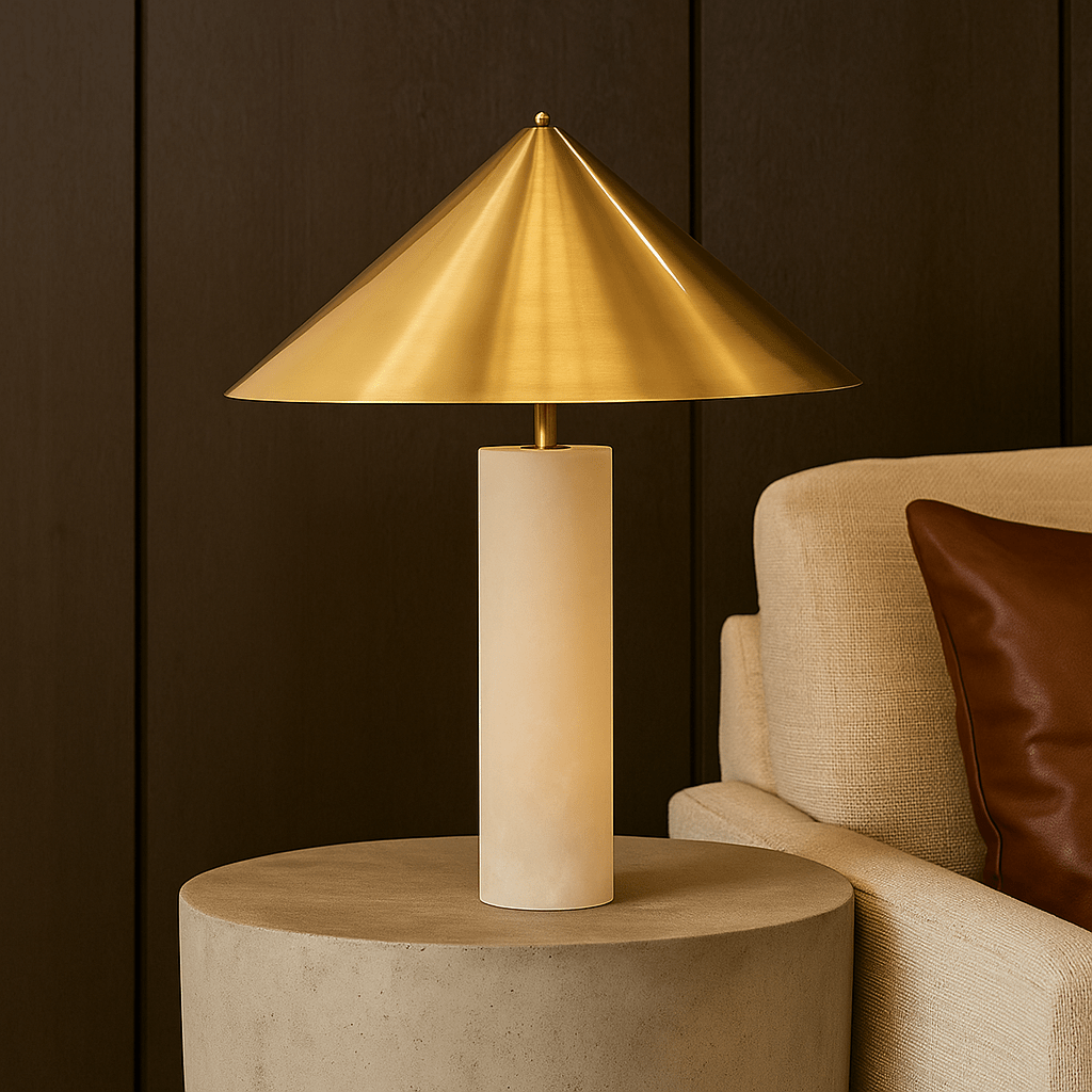 A striking minimalist design that effortlessly blends with various interior styles and perfect for reading or relaxing. The radiant Stockholm Alabaster Table Lamp, boasts a luxurious golden conical shade and solid alabaster base. Known for its translucent beauty, Alabaster natural stone grounds this lamp with a touch of sophistication. A versatile and stylish addition to your home, the warm glow of the Stockholm Table Lamp exudes elegance and timeless appeal. Note that this item contains natural materials, as unique as you. Therefore colours \ finishes may vary and no two items are identical.