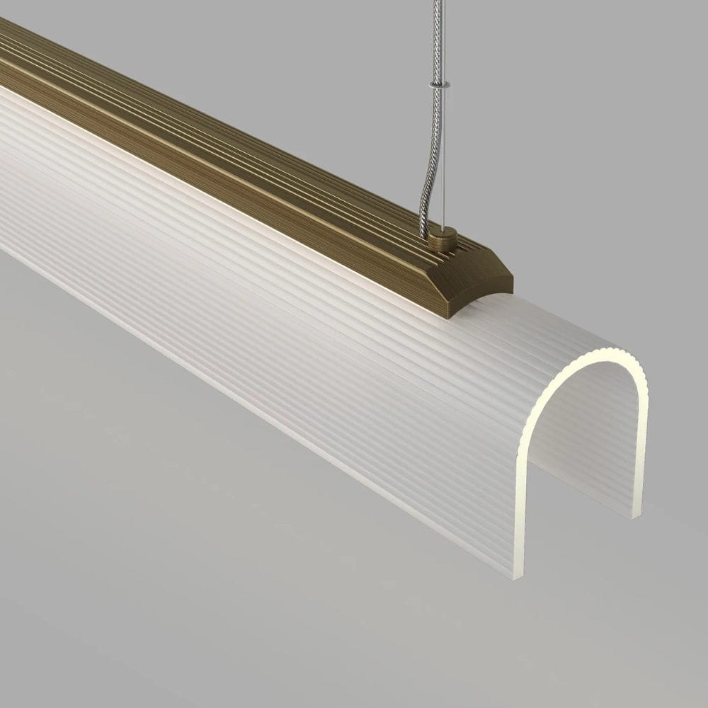 Defined by its clean lines and sharp form, paired with a delicate fluted glass shade slumped by hand, this designer pendant light combines a structured silhouette with refined material contrasts.