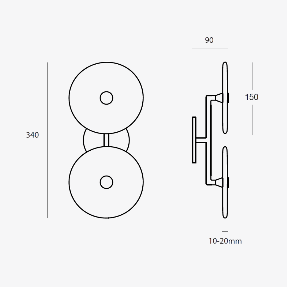 Dimensions Glass (2x): Ø170mm Wall Mount: H110mm x D15mm Fixture Projection: 90mm Total Fixture Height: 340mm |