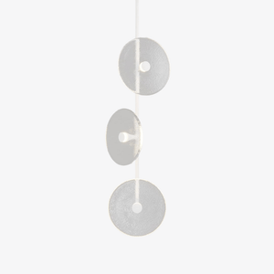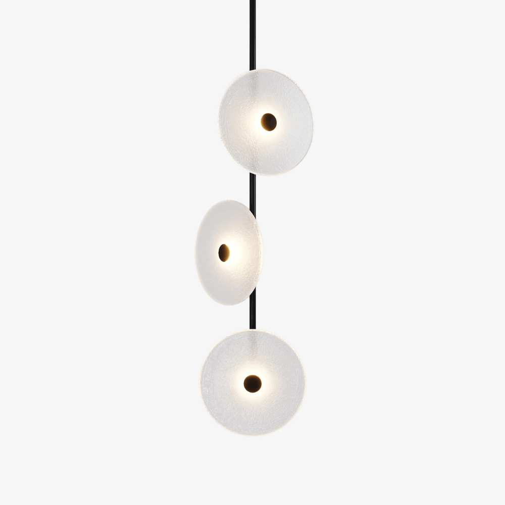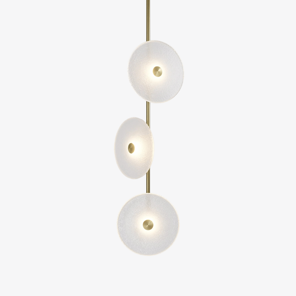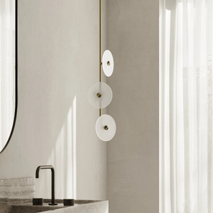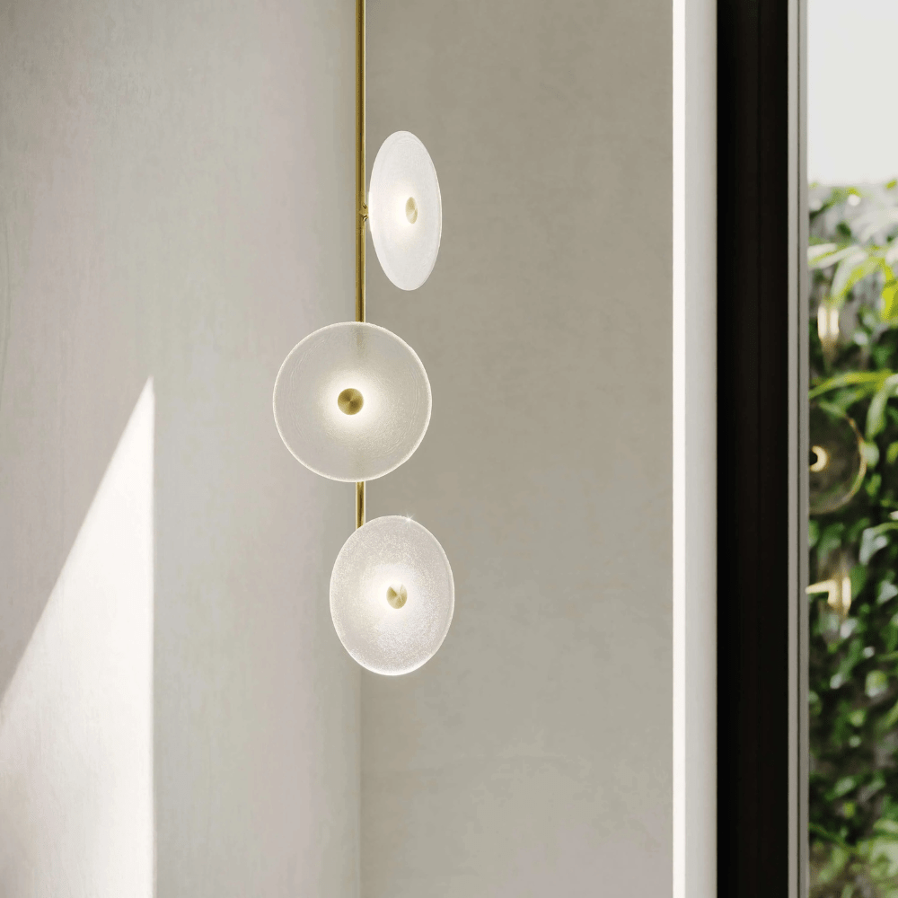 Elevate your space with the Coral Trio pendant light, a captivating modern centrepiece perfect for entryways, bathrooms, and kitchen islands. Three exquisite glass-blown discs are elegantly suspended from a rod, available in a selection of finishes including natural brass, steel finish, matte black, matte white, or medium bronze powder coating. Available in a centred or off-centred installation, opt for frosted or clear glass to match your style and set the mood with a choice of warm, warm white, or white LED temperatures. Meticulously hand-blown using premium Swedish clear glass, each disc carries the distinctiveness of SOKTAS Glass designs, promising an unparalleled and personalised lighting masterpiece that adds both elegance and character to your space.