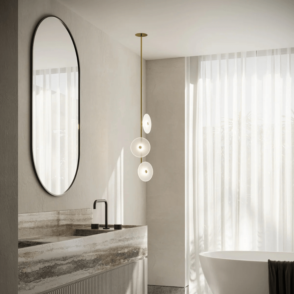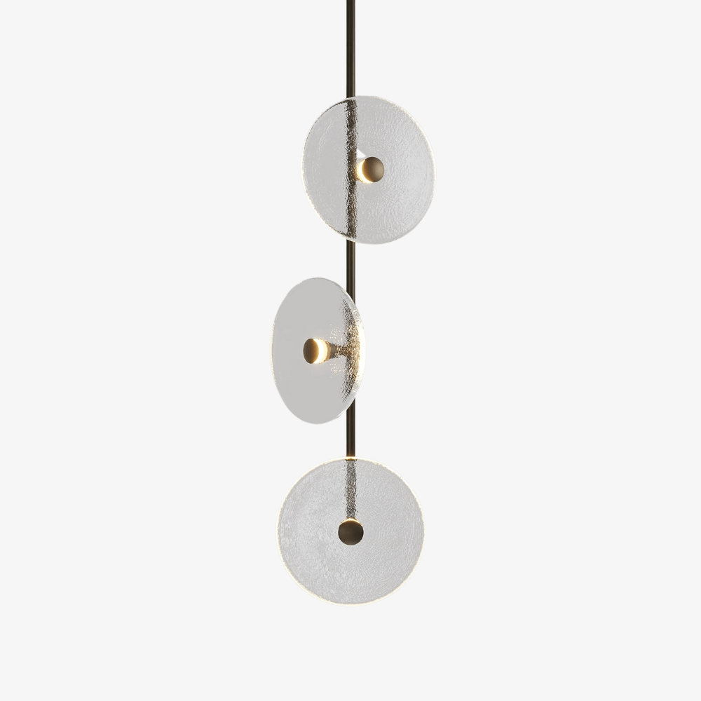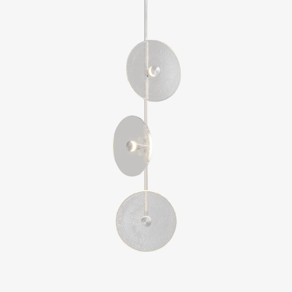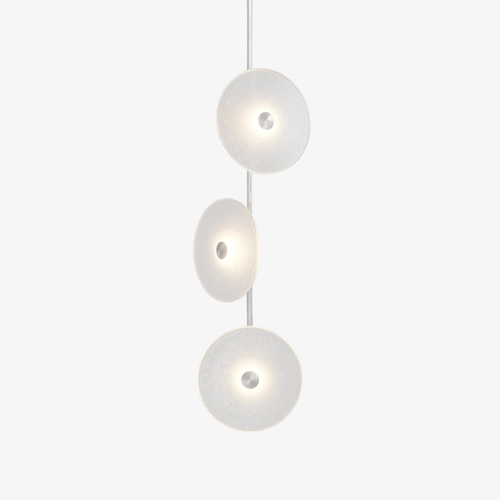 Elevate your space with the Coral Trio pendant light, a captivating modern centrepiece perfect for entryways, bathrooms, and kitchen islands. Three exquisite glass-blown discs are elegantly suspended from a rod, available in a selection of finishes including natural brass, steel finish, matte black, matte white, or medium bronze powder coating. Available in a centred or off-centred installation, opt for frosted or clear glass to match your style and set the mood with a choice of warm, warm white, or white LED temperatures. Meticulously hand-blown using premium Swedish clear glass, each disc carries the distinctiveness of SOKTAS Glass designs, promising an unparalleled and personalised lighting masterpiece that adds both elegance and character to your space.