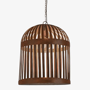 Esch Cage features individual lengths of iron strips that are woven together and held in place by rivets, suspended beneath a graceful dome.