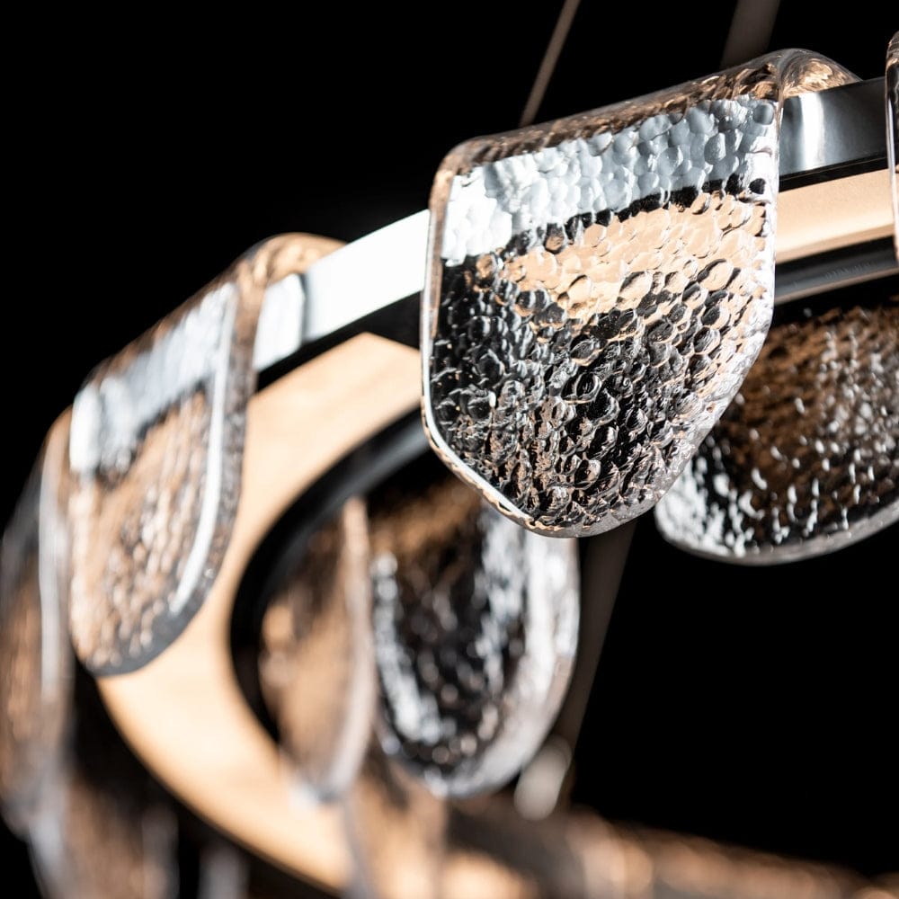 A riverbed of light. Stunning heavily-textured, clear poured artisanal glass in varying sizes are formed and shaped, then positioned on a round LED light-guide platform to stunning visual effect. Inspired by the cold icy streams of Vermont, adorned with ice-covered rocks and boulders, designer Andy Morter envisioned the Riverbed Collection to be like the frozen stones set along the river’s edge.