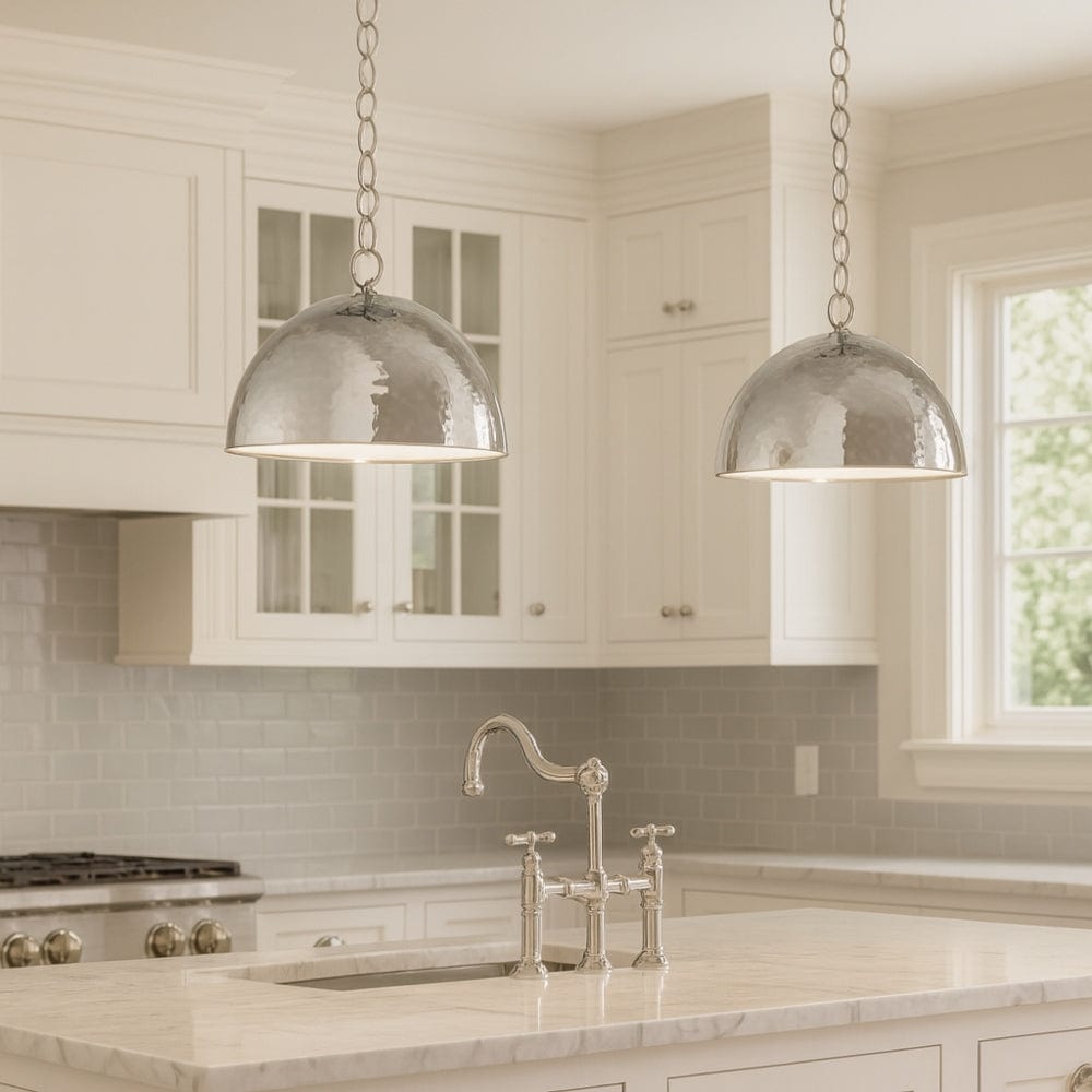 The Whare modern coastal collection from ED Ellen DeGeneres Crafted by Generation Lighting includes pendants, wall sconces and table lamps with finishes in Burnished Brass and Polished Nickel. This collection highlights detailed craftsmanship, with a hand-forged, hammered texture exuding the look of fluidity. The reflective finish encompassing the oversized shades bring a touch of refined elegance.